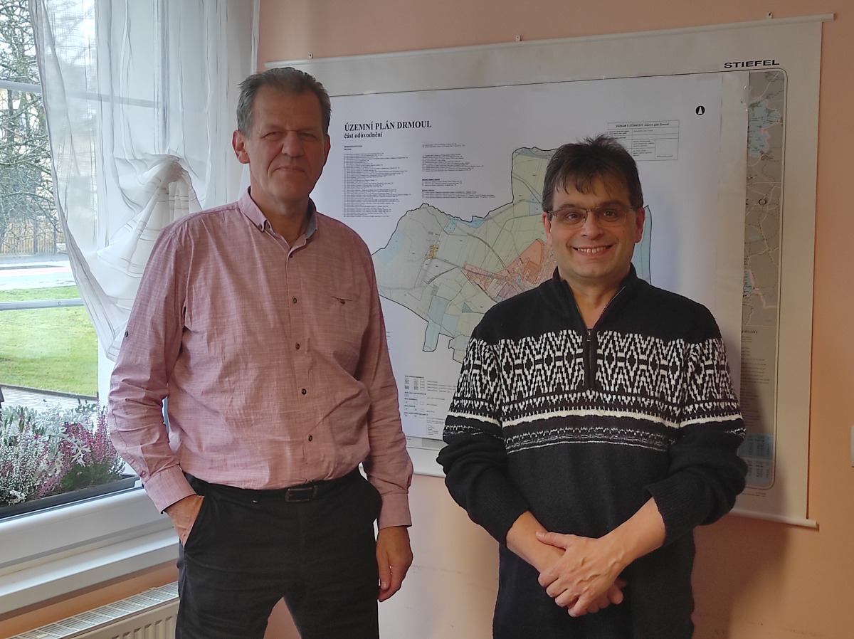 Ukončení výjezdového dne bylo v obci Drmoul. Na tamním obecním úřadě mě pan starosta Josef Švajgl informoval o dění v obci, o přípravě různých projektů a o problematice výzev a dotací pro obce z fondů EU. Obec je v tomto ohledu dobře připravená, ale trápí ji změny v podmínkách dotačních programů, a to i v průběhu již běžících výzev. V obci žije okolo 1020 obyvatel. První písemná zmínka o obci pochází z roku 1479.