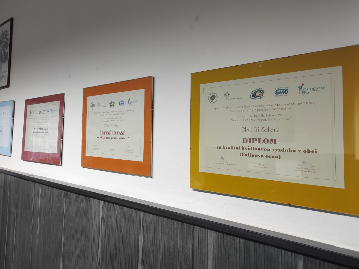 Jako první jsem navštívil obec Obec Tři Sekery. Na obecním úřadě jsme s paní starostkou Ivou Stolcovou, panem místostarostou Janem Zugárekem a paní zastupitelkou Dagmar Strnadovou diskutovali o dění v obci a podrobněji například o problematice financování nepedagogických pracovníků ve školství, které by se mohlo od září příštího roku změnit. Shodli jsme se, že není možné, aby byli tito pracovníci v budoucnu placeni z rozpočtu obce bez toho, aby byly příjmy obcí adekvátně navýšeny. V obci Tři Sekery včetně přilehlých částí Chodovská huť, Tachovská Huť a Krásné žije přibližně 1000 obyvatel. První zmínka o obci pochází z roku 1555. Podle pověsti tudy někdy v první polovině 15. století projížděli norimberští formani se svým zbožím. Po přenocování v hlubokém lese je probudilo slunce, které osvětlilo třpytící se kameny. Podle váhy a lesku je považovali za rudy stříbra nebo mědi. Několik vzorků vzali pro svého pána a místu označili třemi záseky na mohutné jedli. Po prozkoumání kamenů se potvrdil vysoký obsah mědi. Brzy sem dorazili první horníci z Norimberku a začali rudu těžit. Tak vznikla hornická osada Tři Sekery. Později byla dána do znaku obce jedle, která má u kořenů tři zaseklé sekery.