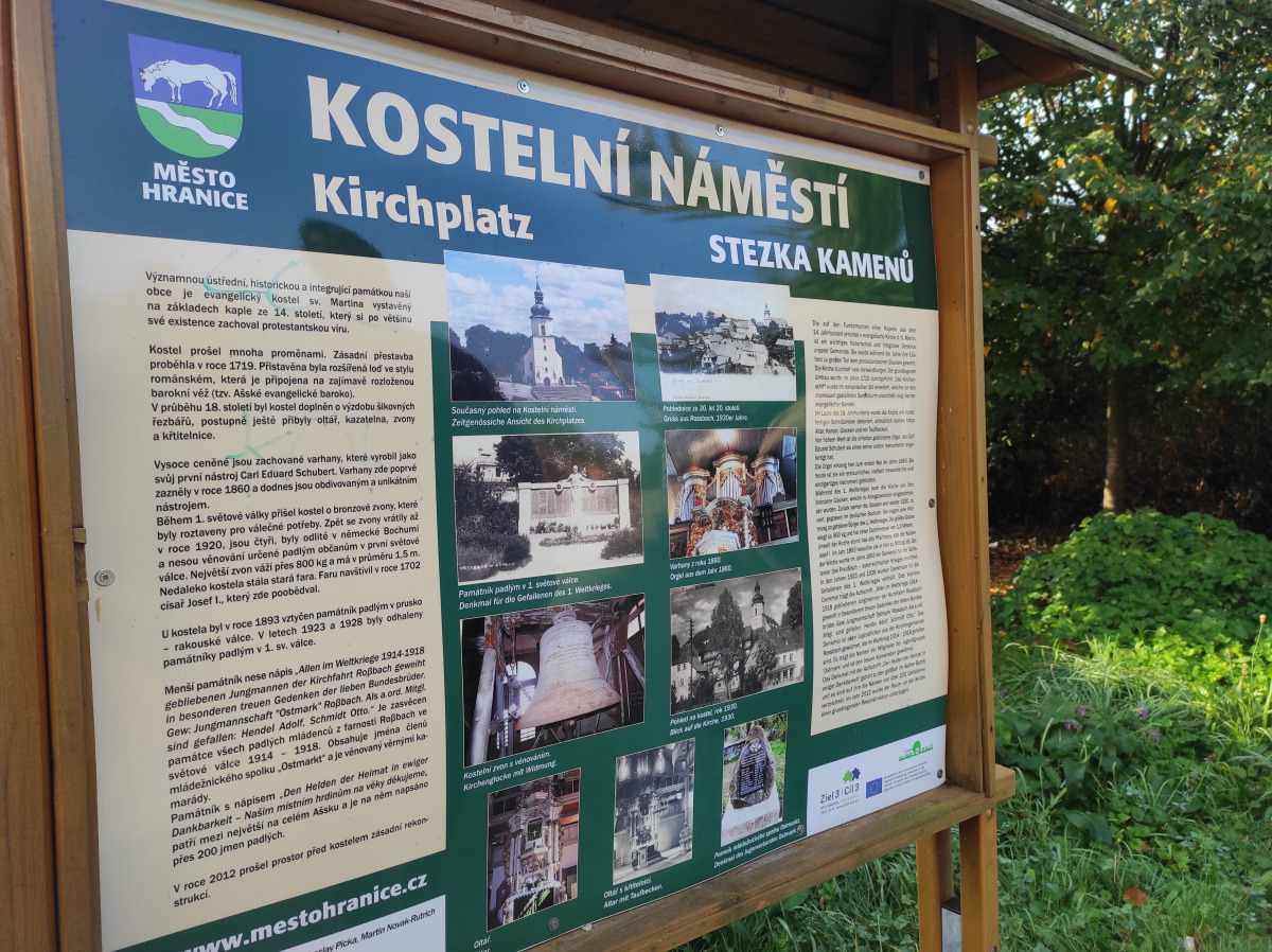 Nejstarší zmínka o Hranicích pochází z roku 1413 z kupní smlouvy, kterou Neubergové prodali Zedtwitzům obec Hranice a okolní obce. V roce 1881 byly Hranice povýšeny císařem Josefem I. na městys. Počátkem 19. století se začal rozvíjet textilní průmysl a výrobny v Hranicích v roce 1806 patřily k největším v Čechách. Postupně však docházelo k útlumu a po roce 1840 rozkvět textilního průmyslu postupně zaniká. Prohlídkou města si nelze nepovšimnou evangelistického kostela sv. Martina, který je vystavěný na základech kaple ze 14. století. U kostela byl v roce 1893 vztyčen památník padlým v prusko-rakouské válce. V letech 1923 a 1928 byly odhaleny památníky padlým v 1. sv. válce. Hranice, které se původně jmenovaly Rossbach, získaly své jméno od potoka, který protéká středem města. Ten v počátcích osidlování sloužil k napájení koní (odtud Ross-bach = koňský potok). Kůň pijící z potoka je dodnes součástí městského znaku, který můžeme spatřit jak na radnici, na budovách ve městě, ale třeba i jako sochu koně stojícího se skloněnou hlavou v revitalizované části středu města na vyvýšené části nad náměstím v blízkosti popisovaného evangelistického kostela. Zde je i architektonicky znázorněno těleso onoho potoka směřujícího do středu náměstí. Revitalizace oblasti proběhla v roce 2012 z evropských dotací.